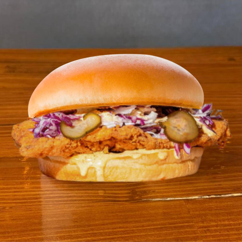 150g de pollo crunchy + queso cheddar + pan de la casa + salsa tartara + pepinillos + col morada