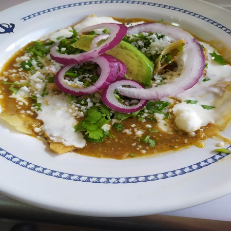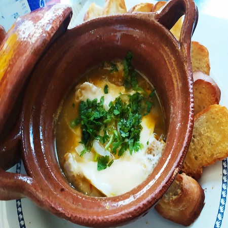 Huevos ahogados en salsa verde con queso manchego fundido.