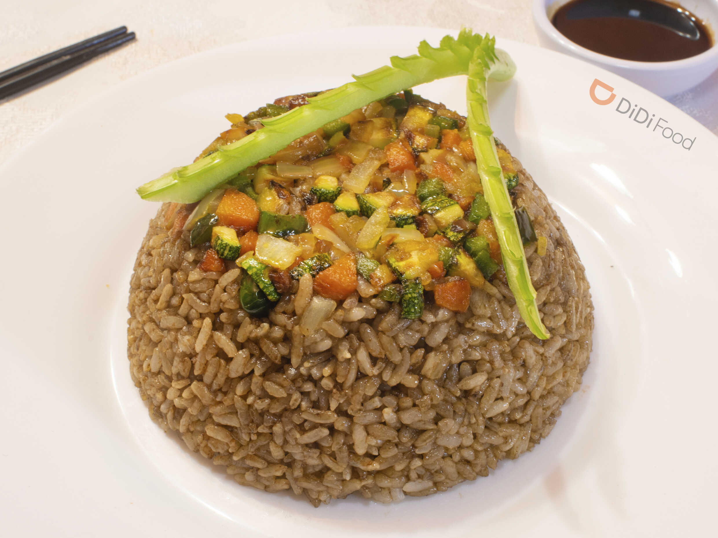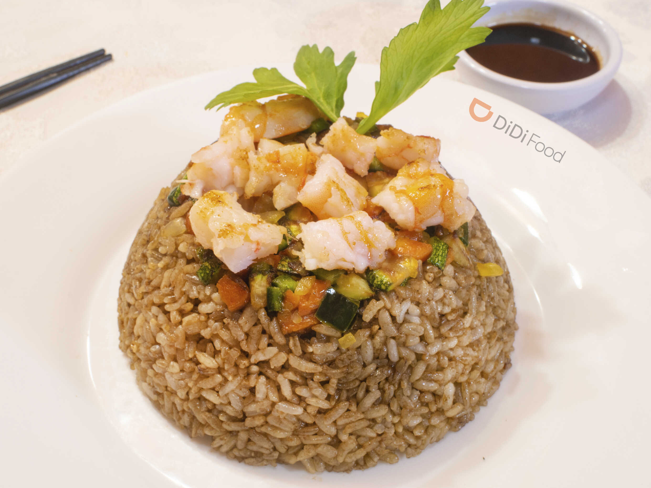 Arroz a la plancha con mantequilla, verduras y camarón, sazonado con salsa de soya.