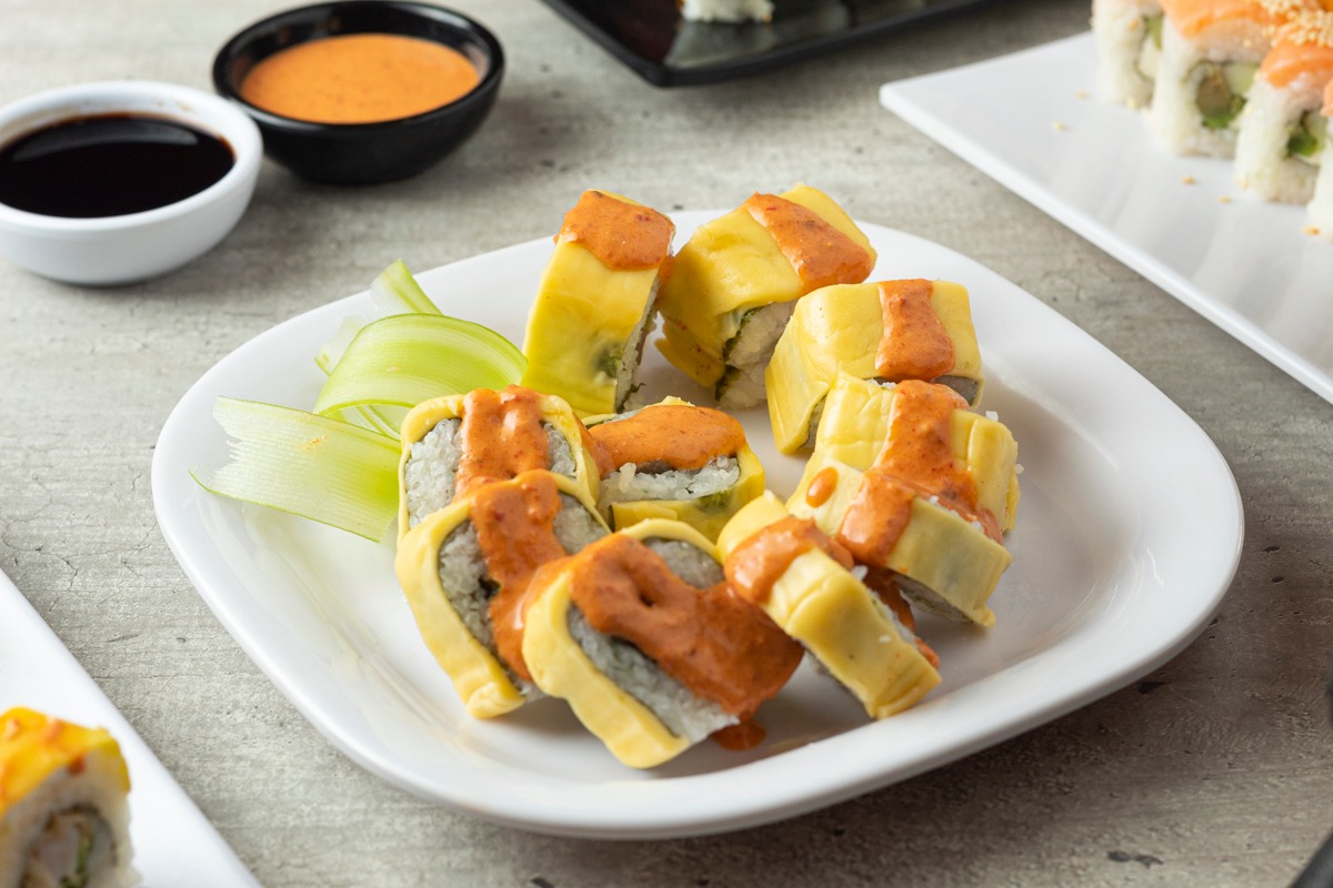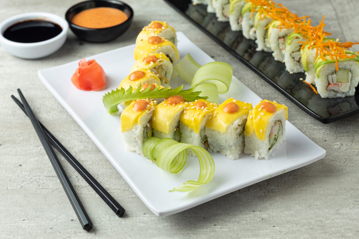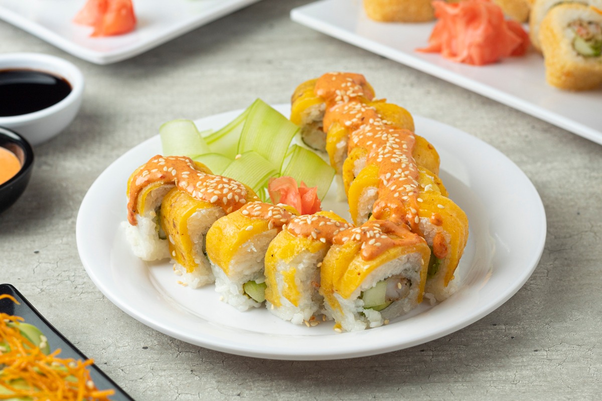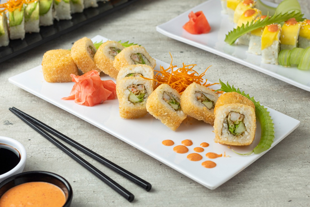 Por dentro: Camarón capeado, aguacate y pepino. Por fuera: Queso crema, plátano frito y ajonjolí.