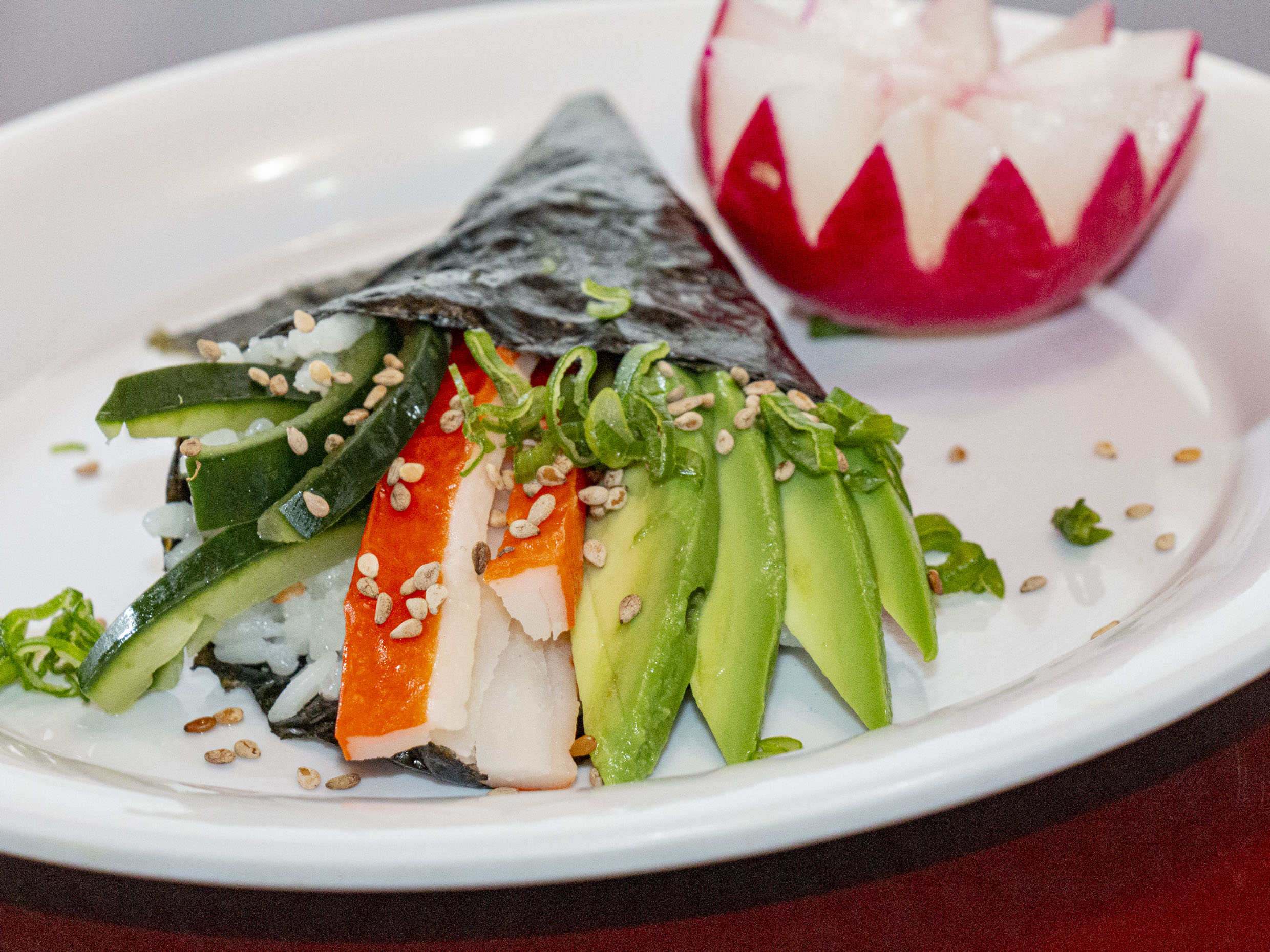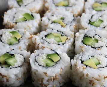 Por dentro: Aguacate, pepino y queso crema. Por fuera: Ajonjolí.