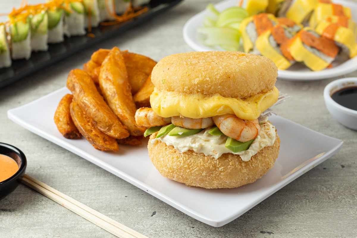Crujiente arroz empanizado, camarones a la plancha, queso crema, aguacate, queso manchego gratinado y aderezo de la casa acompañado de papas fritas.