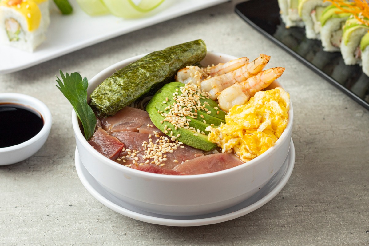 Sopa de fideos de trigo acompañado de atún aleta amarilla, camarones a la plancha, huevo al gusto, alga nori, aguacate y ajonjoli. 1lt.
