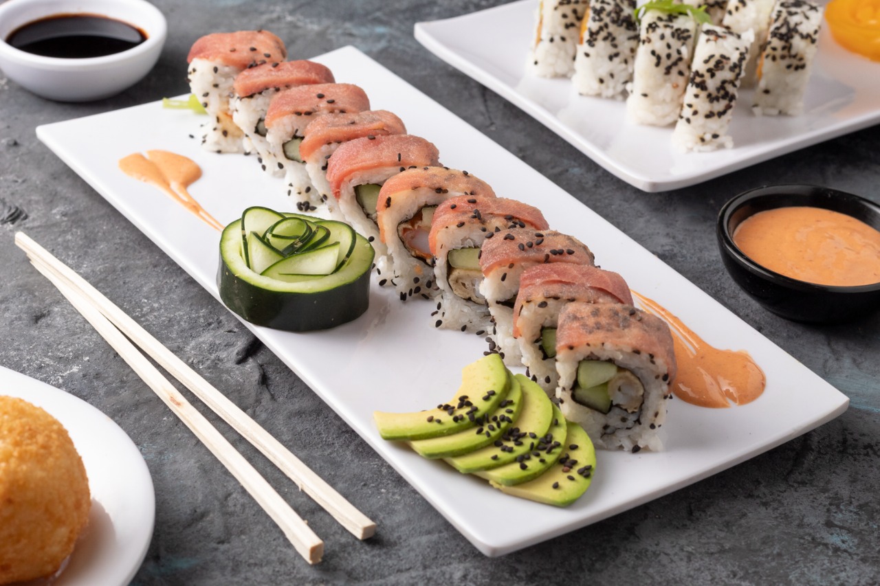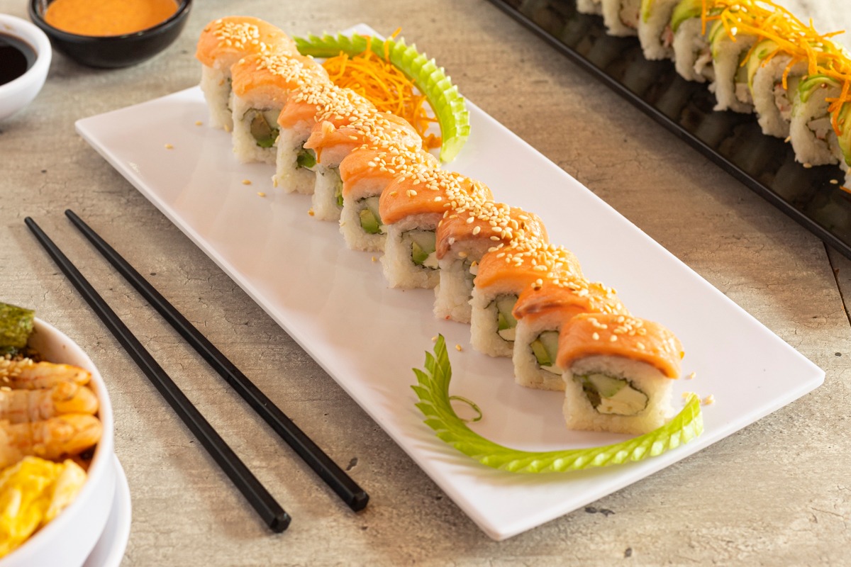 Por dentro: Aguacate, pepino y queso crema. Por fuera: Salmón.