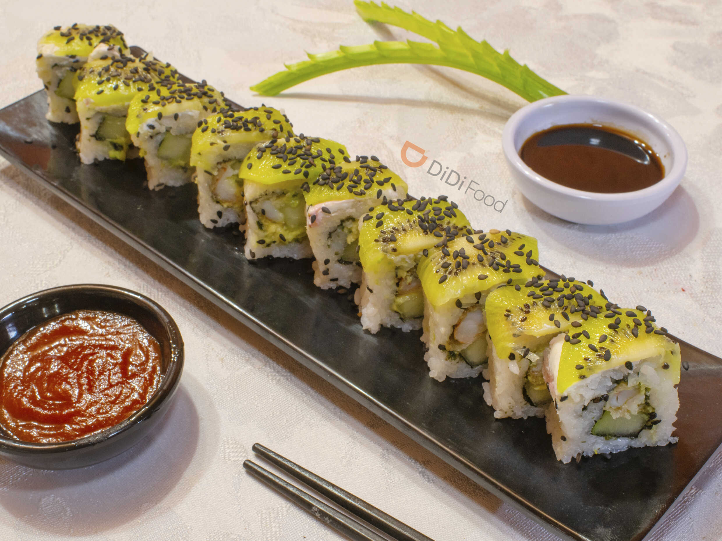 Por dentro: camarón capeado, aguacate y pepino. Por fuera: Queso crema y duraznoo