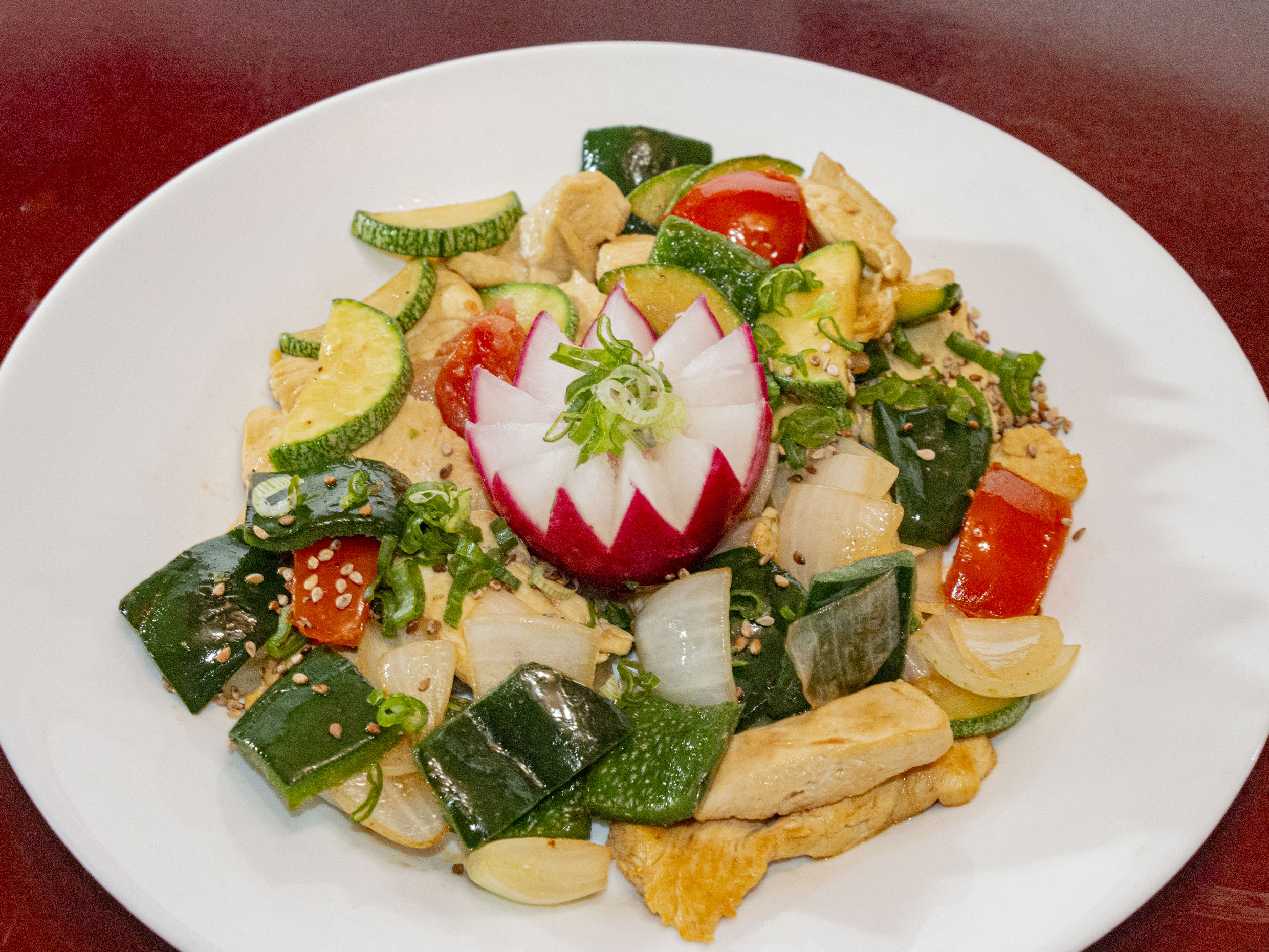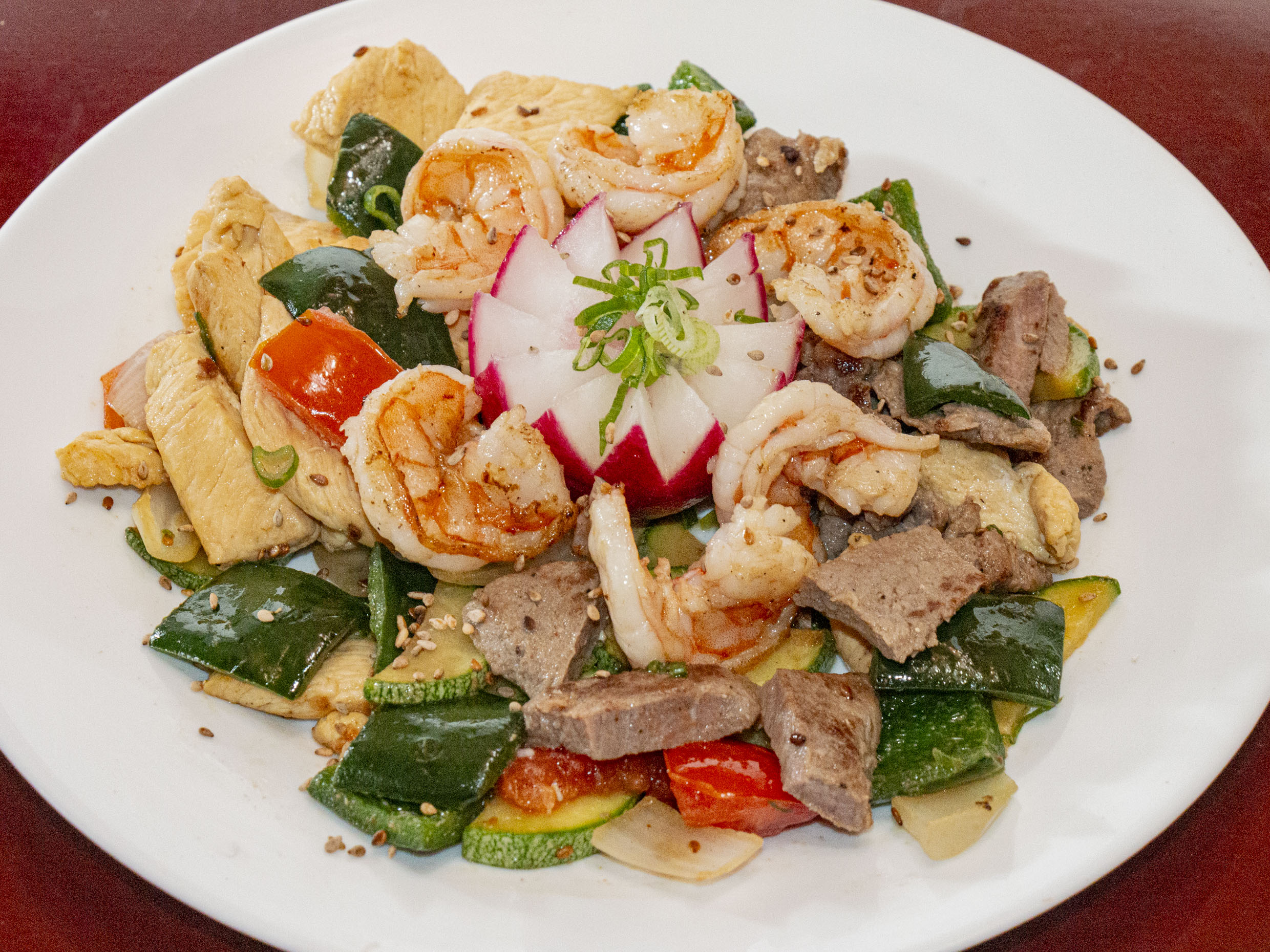 Verduras a la plancha acompañadas de pollo, filete de res, camarón y arroz.