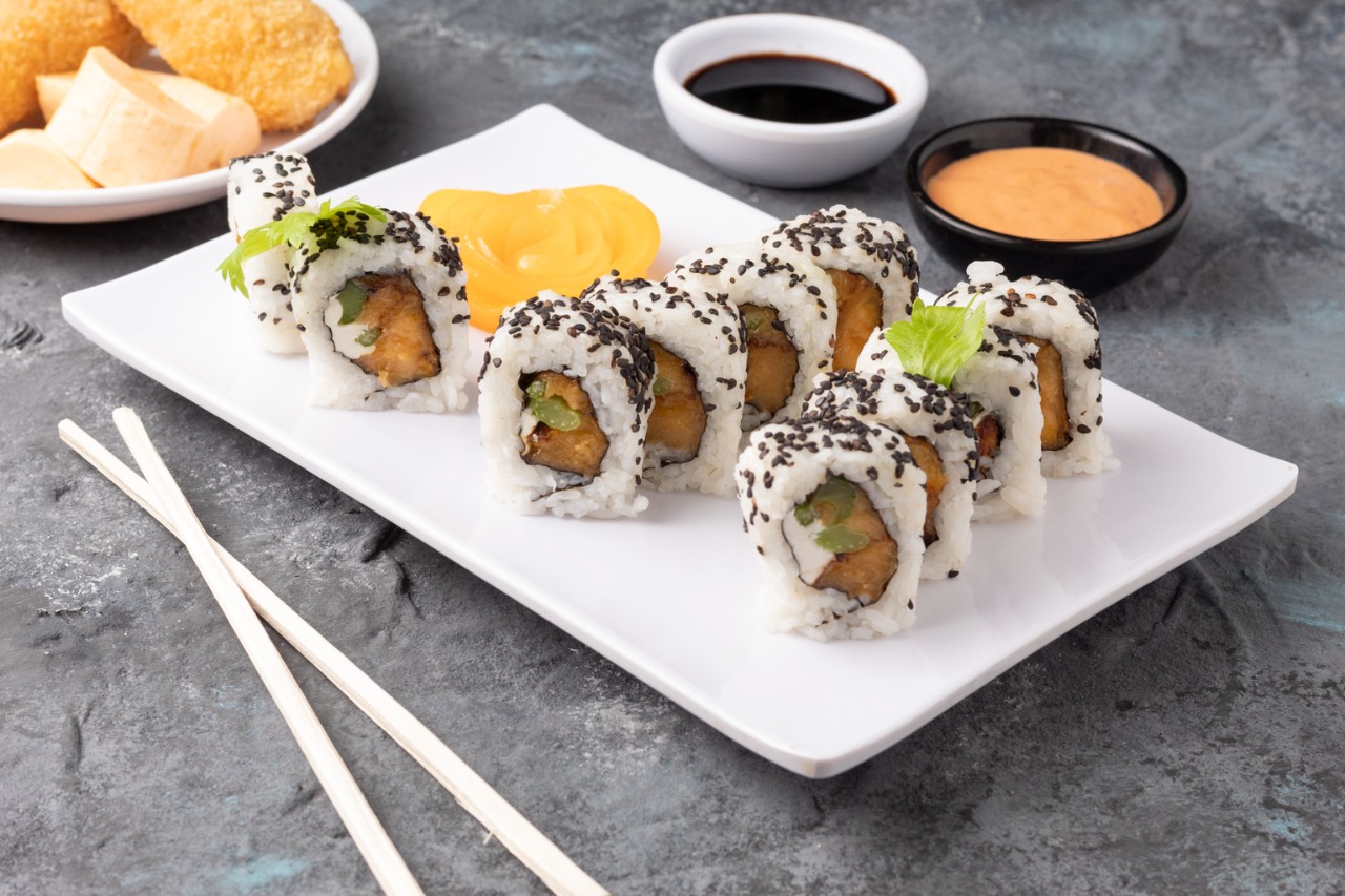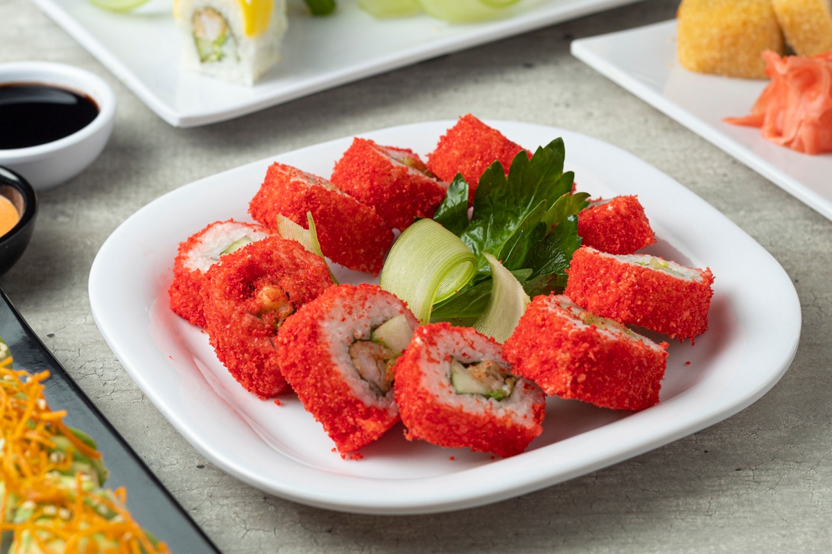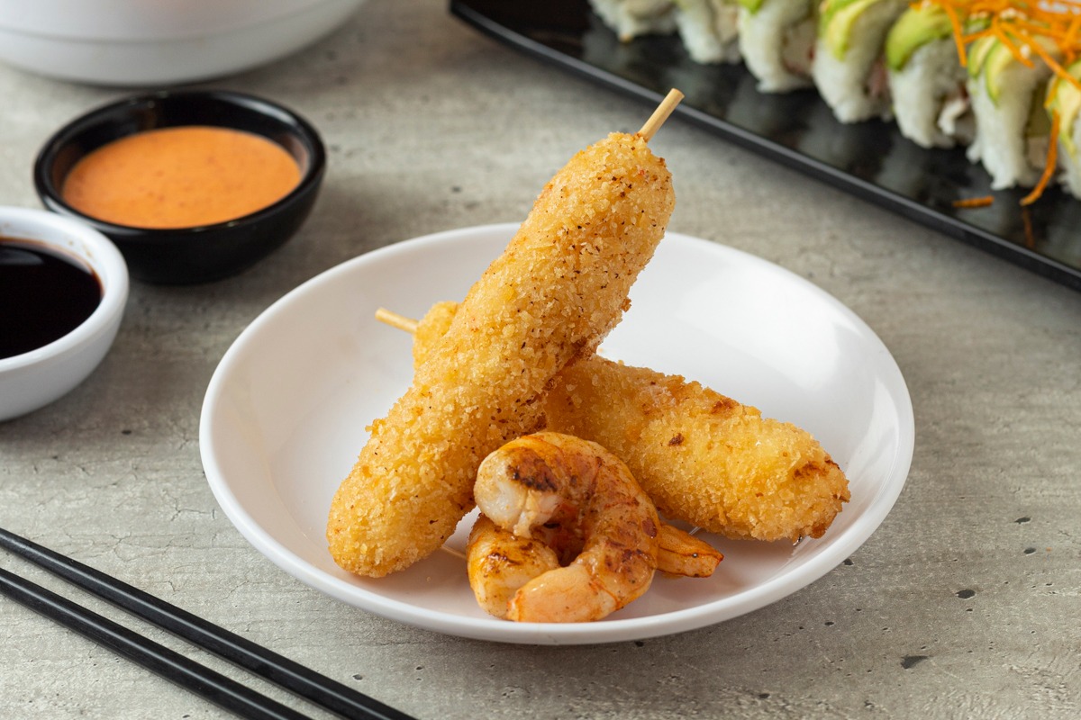 Por dentro: Surimi, aguacate y peino. Por fuera: Queso crema y empanizado.