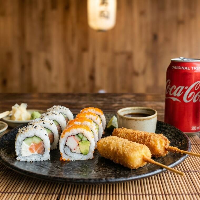 1/2 Maki Filadelfia 1/2 Maki California 1 pza. kushiague de queso 1 pza. kushiague de platano 1 Coca-Cola regular 355ml.