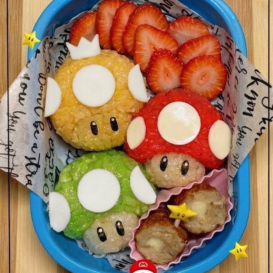 3 Pzas. de onigiri tematico c/queso 1 Porcion de fresas 2 Kushiagues de queso