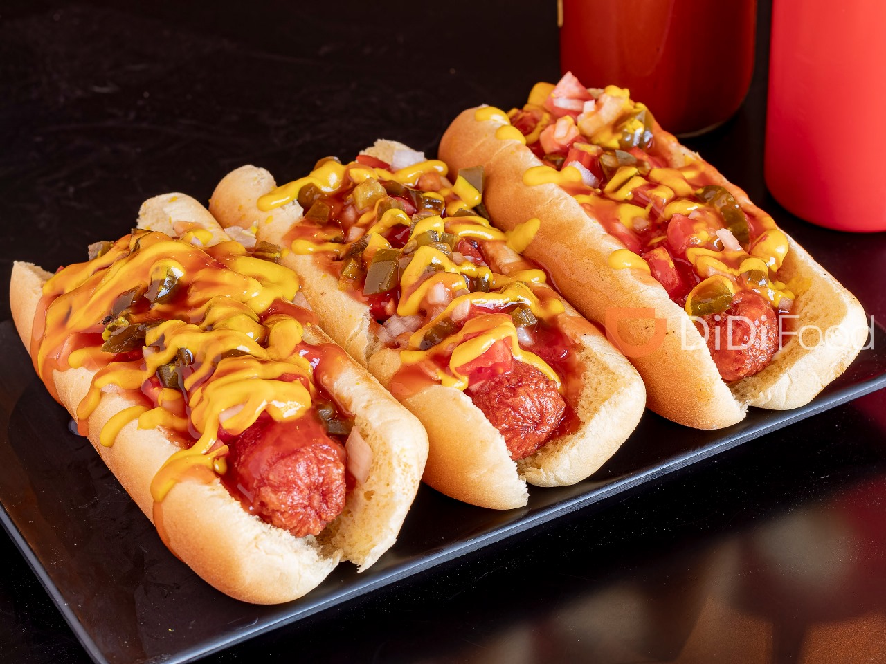Hot Dogs sencillos con Mostaza,catsup, mayonesa, acompañado de verduras