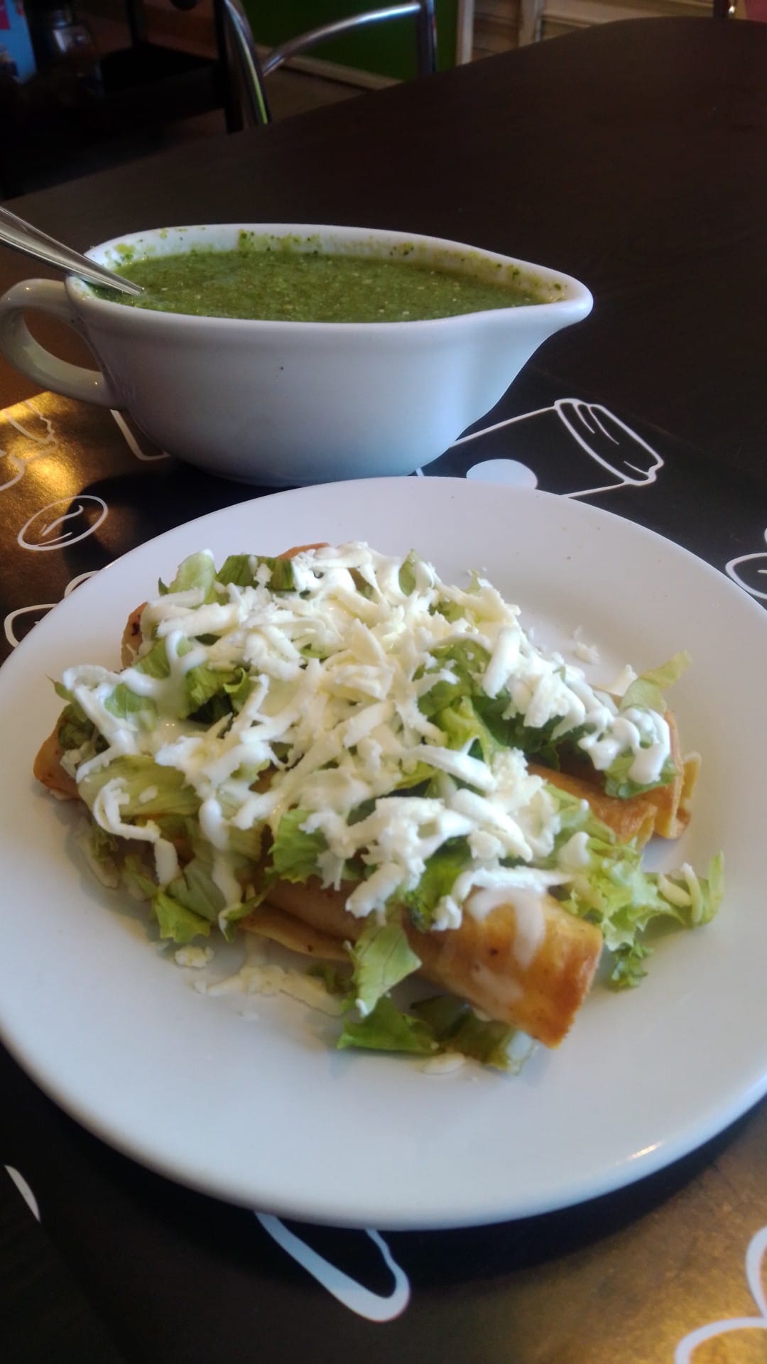 4 piezas de tacos con lechuga, crema, salsa y queso.