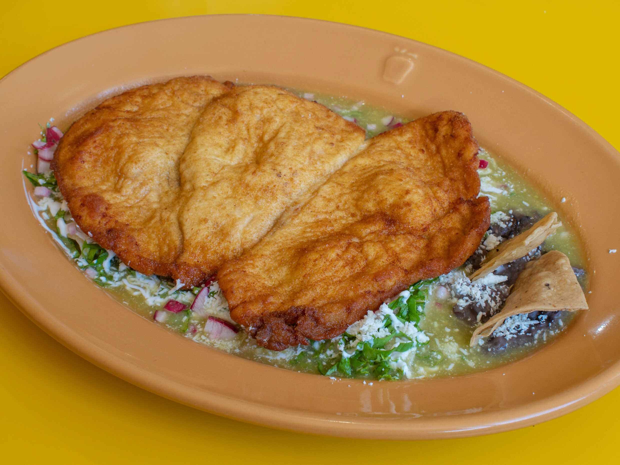 Acompañada de frijoles refritos y un complemento.