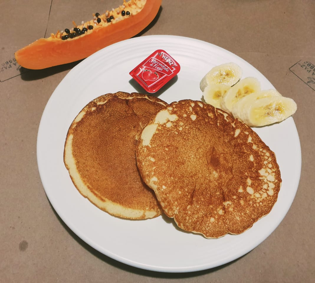 2 hot cakes con mermelada. Incluyen Café, pan tostado y su complemento a elegir