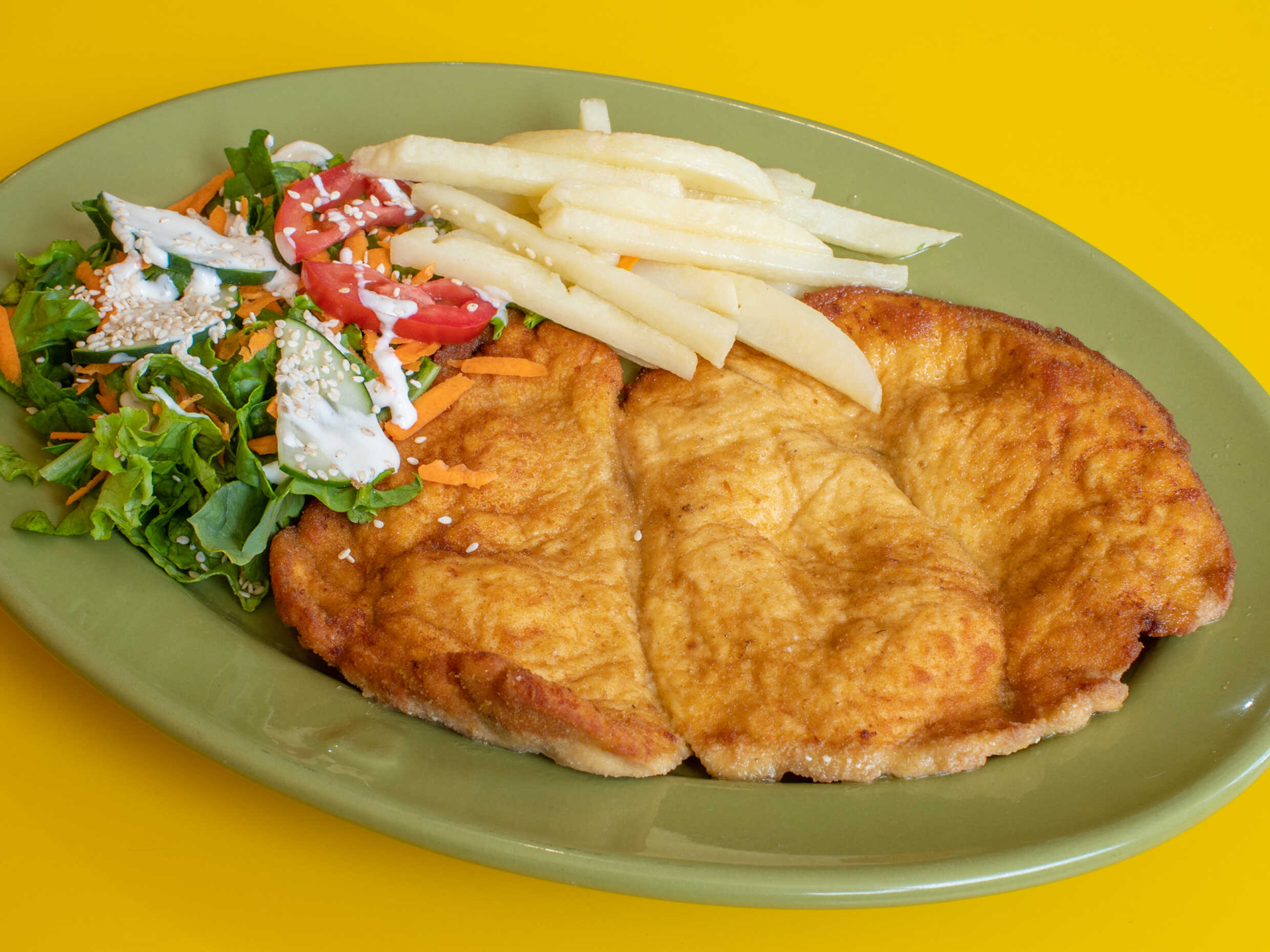 Pechuga empanizada con ensalada y papas a la francesa.