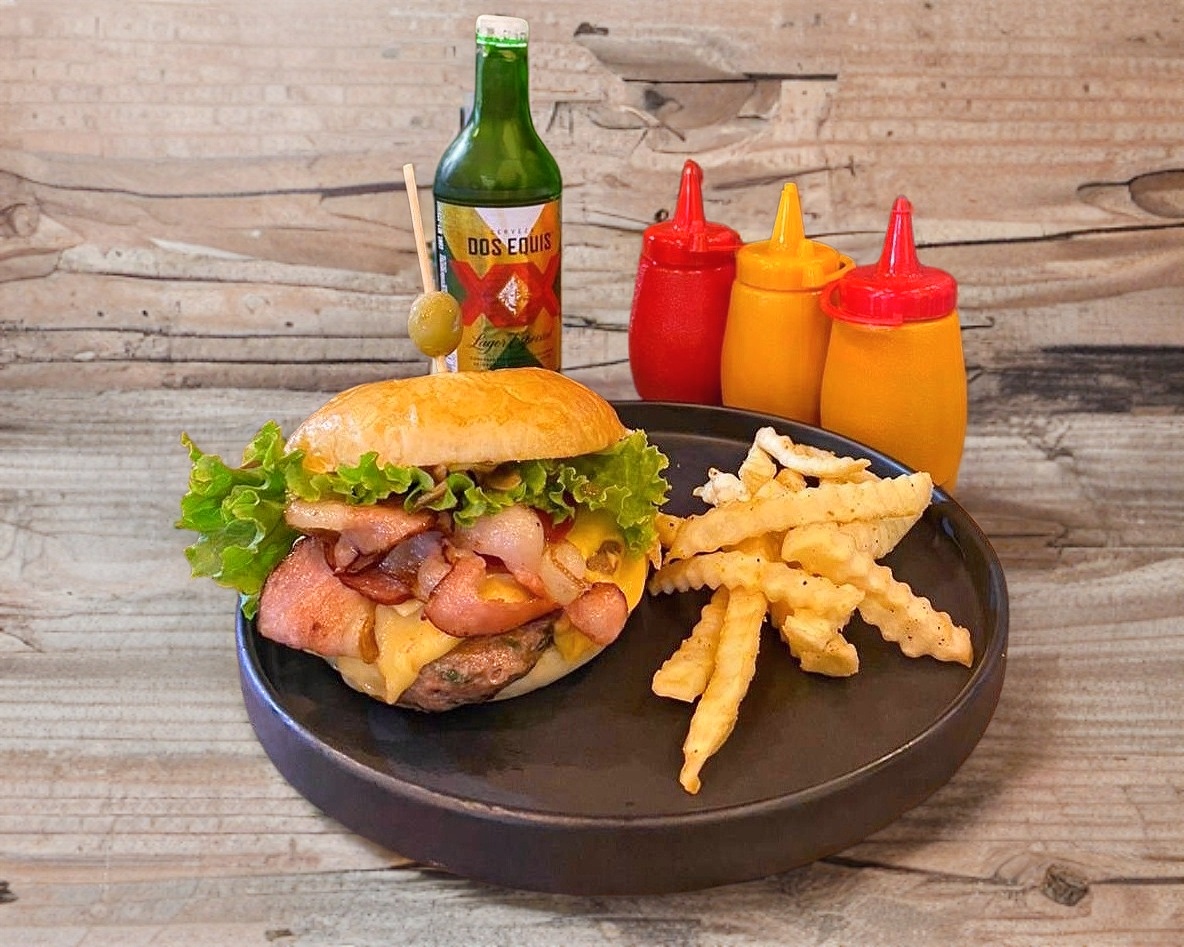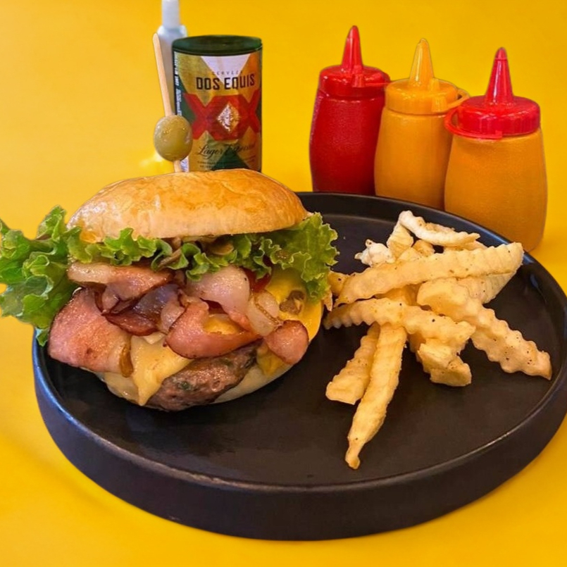 carne de res, queso gouda, queso amarillo, salsa BBQ, lechuga, jitomate, cebolla caramelizada y aderezos.