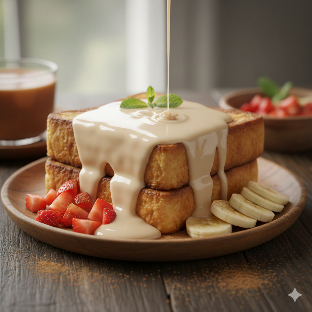 Dos toast de pan artesanal con mantequilla, canela, azúcar, un toque de vainilla, leche condensada y frtuta