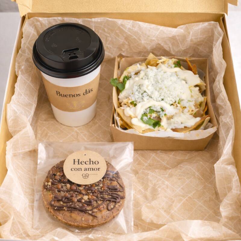 Incluye unos chilaquiles verdes con pollo, un cheesecake ( frutos rojos, nutella cajeta y nuez o pay de manzana) según disponiblidad y un capuchino de caramelo, crema irlandesa o chocolate