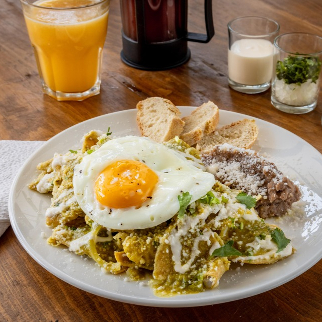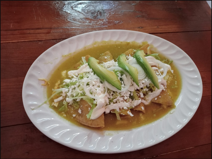 exquisitos chilaquiles con la salsa de tu eleccion, acompañados de pollo, queso, crema cebolla y cilantro, con frijoles refritos a un lado , llevan cafe o ter y fruta del dia