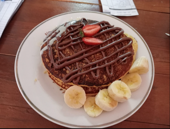 Exquisitos Hot Cakes en salsa de Frutos rojos, servidos con helado y fruta deldia asi como una exquisita jalea frutal