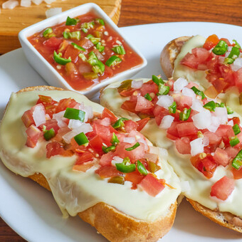 2 Piezas, pan cubierto de frijoles, queso gratín, mantequilla, servido con pico de gallo.