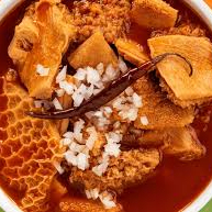 Rellenas de pollo, ahogadas en mole rojo artesanal , crema, queso y cebollita.