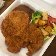 Salsa suiza, gratinadas con queso, rellenas de 2 huevos. Arrachera o milanesa a elegir y aros de cebolla.
