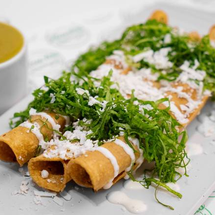 Orden de Flautas rellena de Res o Pollo, lechuga, queso y crema