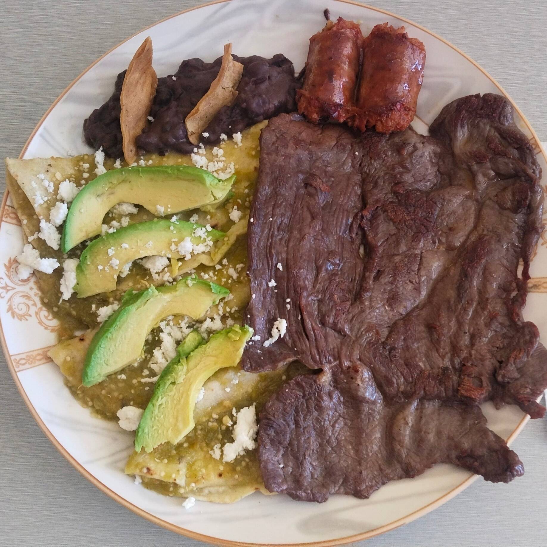 CUATRO ENCHILADAS CON SALSA A ELEGIR, CON CHORIZO, FRIJOLES REFRITOS, 200 GRS DE COSTILLA DE RES
