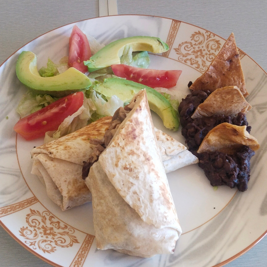 BURRITO DE CARNITAS, CON ENSALADA, ACOMPAÑADO DE FRIJOLES REFRITOS, QUESO RANCHERO Y JAMON