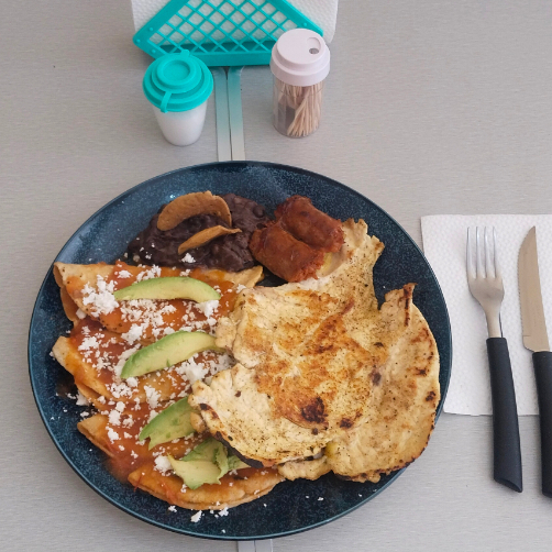 DOS PIEZAS DE HUEVO, ESTRELLADOS SOBRE TORTILLA POCHADA, BAÑADOS CON SALSA VERDE Y ROJA, ACOMPAÑADOS CON CHILAQUILES