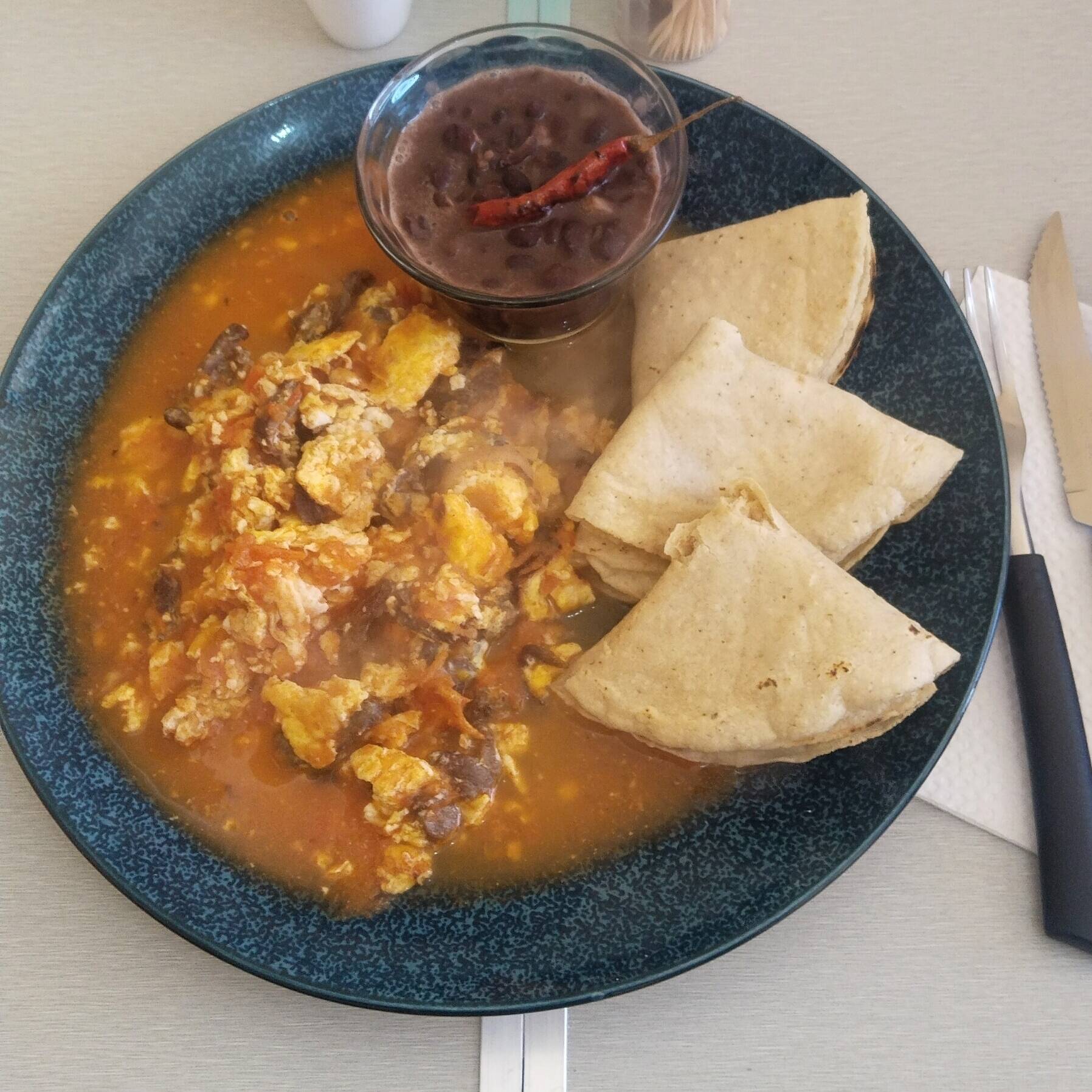 DOS PIEZAS DE HUEVO, REVUELTOS CON CEBOLLA, JITOMATE, CHILE, ACOMPAÑADOS DE FRIJOLES REFRITOS