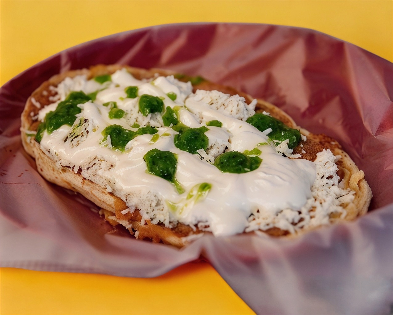 Tortilla frita,salsita verde,queso,crema,