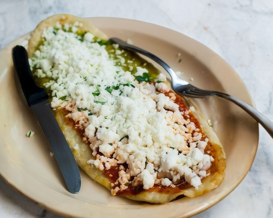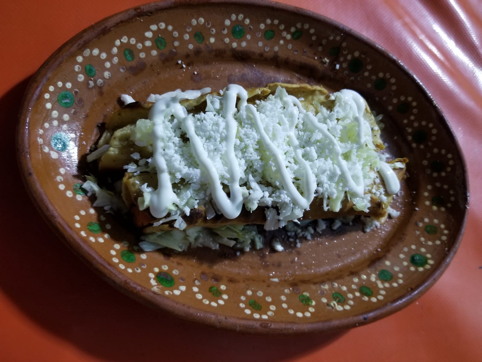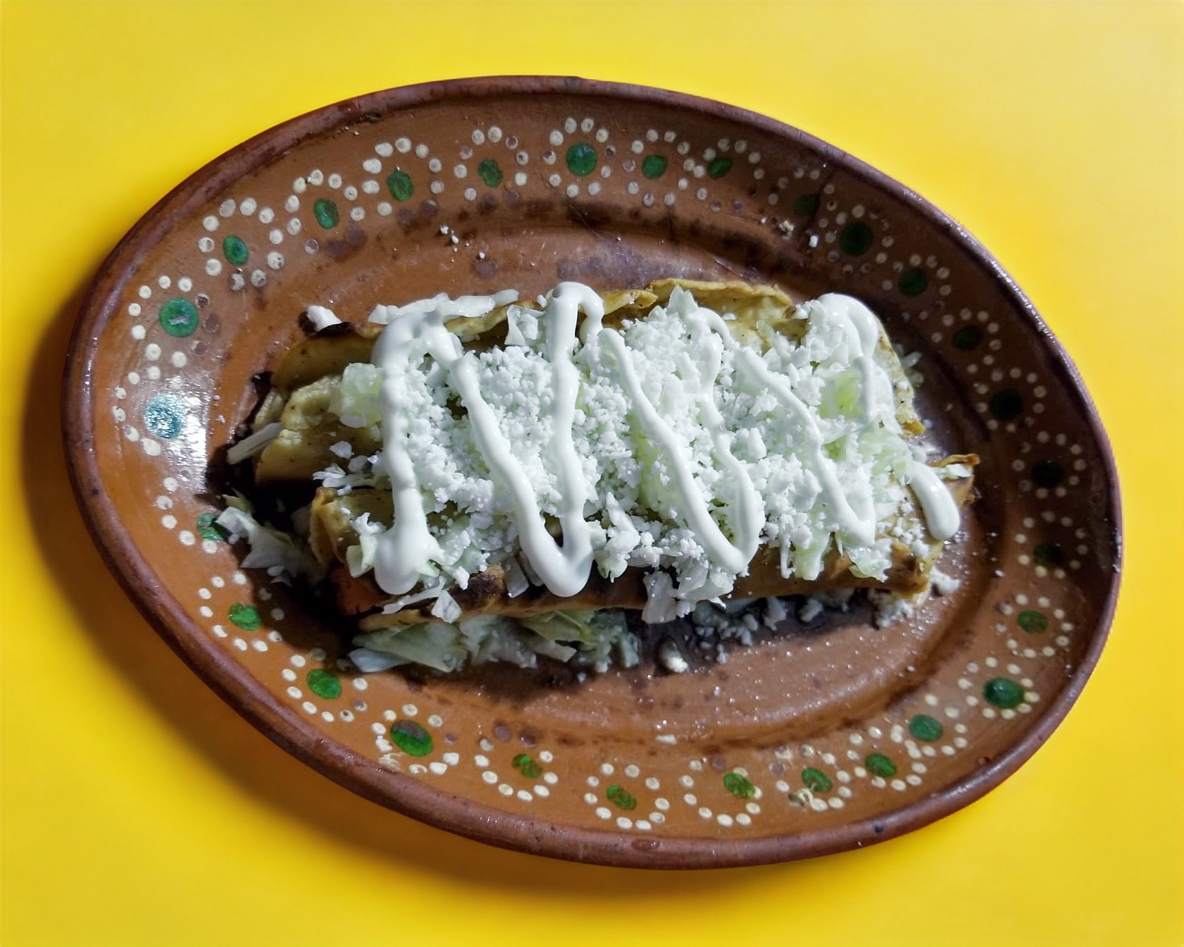 TORTILLAS ECHAS A MANO RELLENAS DE QUESO DE EBRA,SALSA VERDE LECHUGA,QUESO RAYADO,CREMA,RABANOS