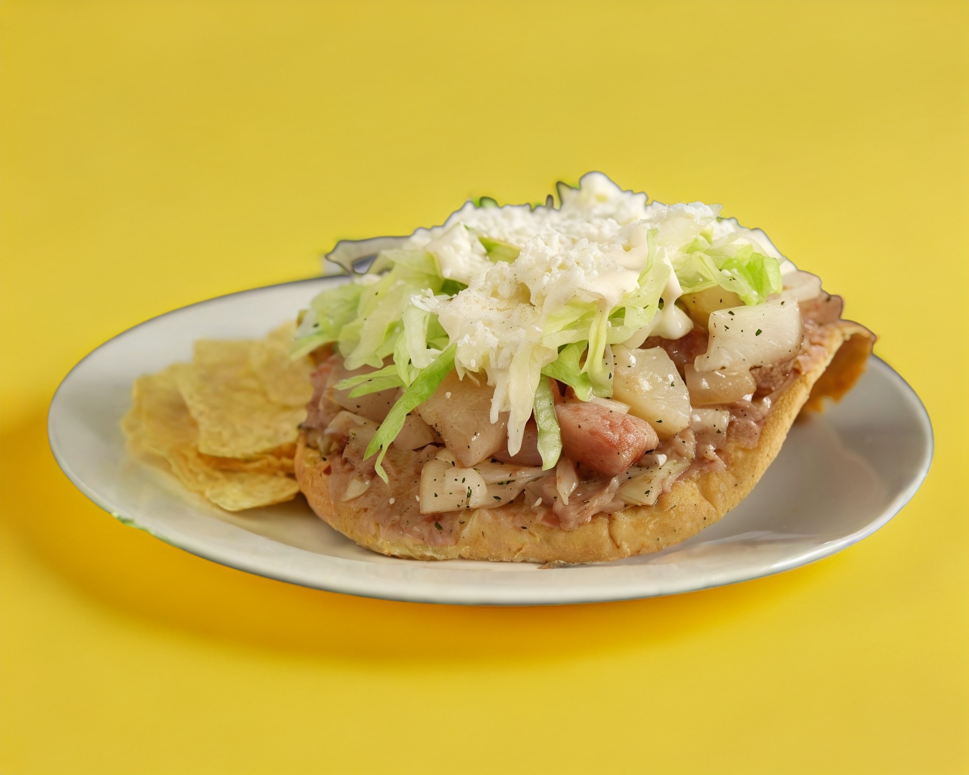 3 tortillas fritas en manteca con papa,salsa,lechuga,queso rayado,rabano y pollo