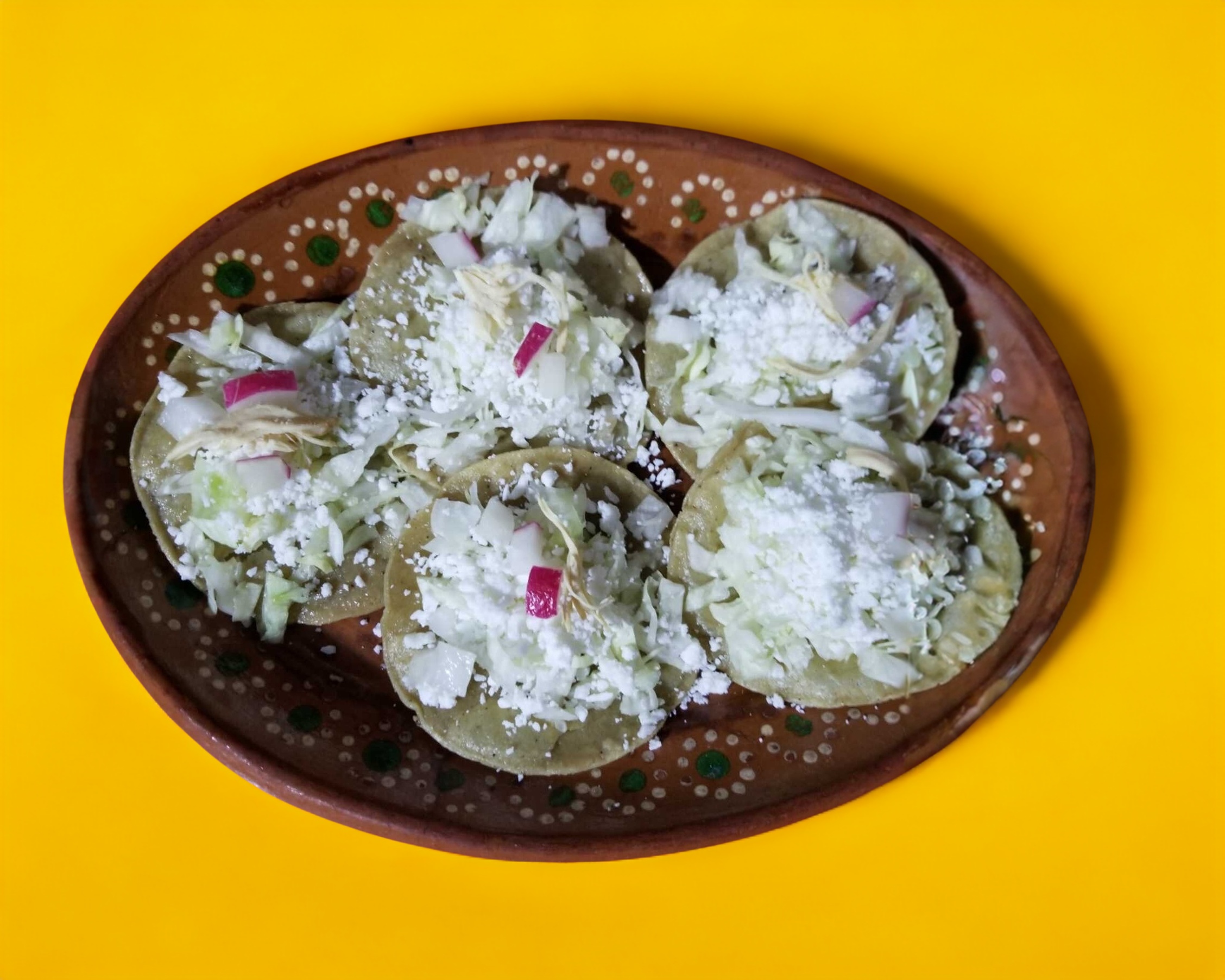 TORTILLA DE MAIZ,SALSA VERDE,LECHUGA,QUESO RAYADO,CREMA,RABANO