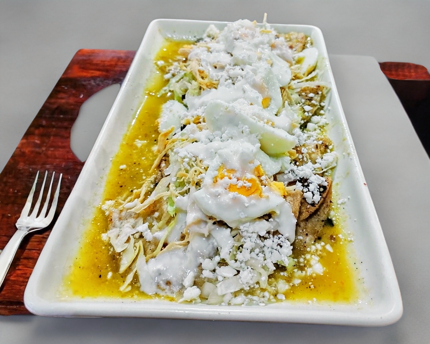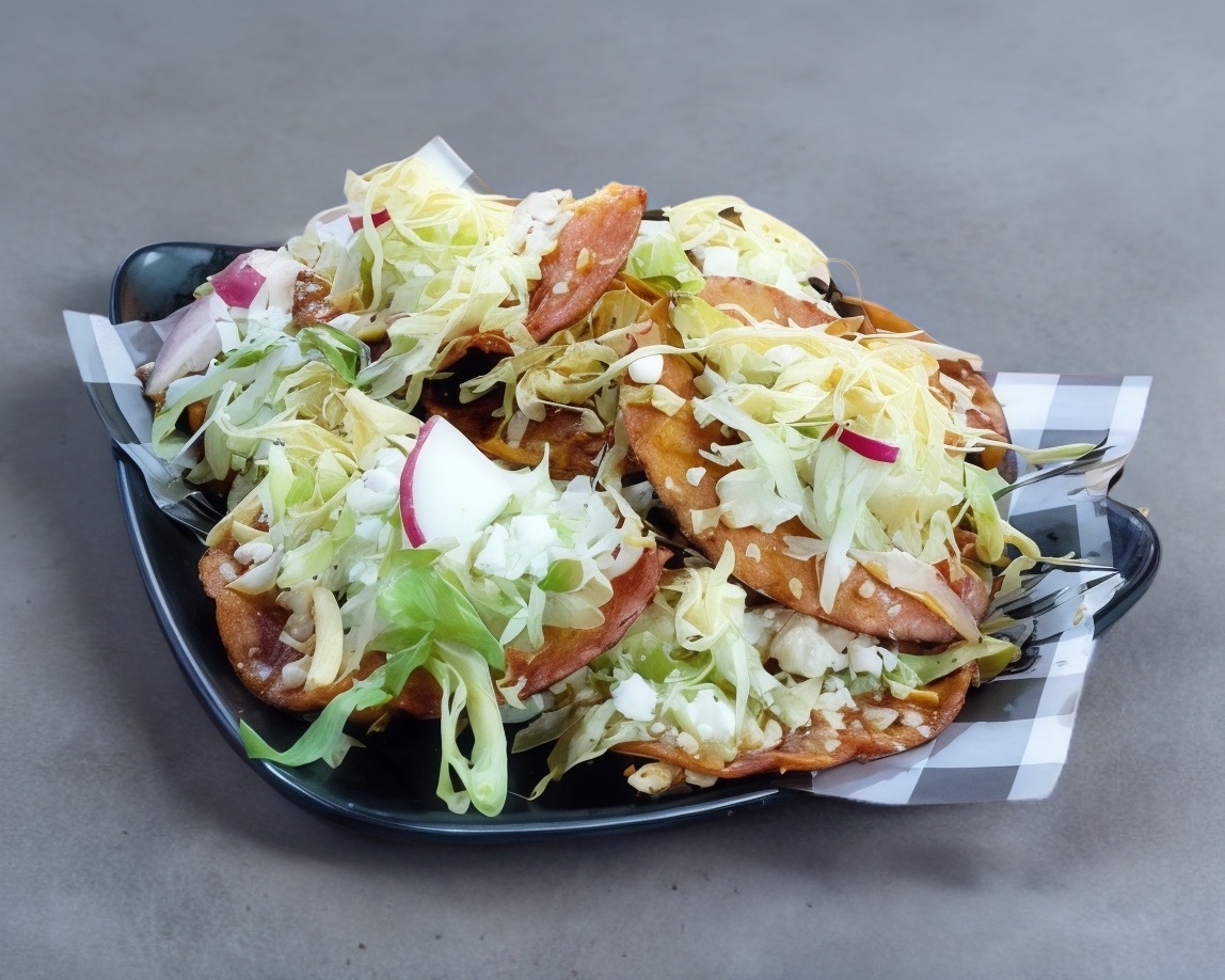 Tortilla de maiz frita bañada en adobo de guajillo, con papa, cebolla, lechuga, queso, rabano y pollo