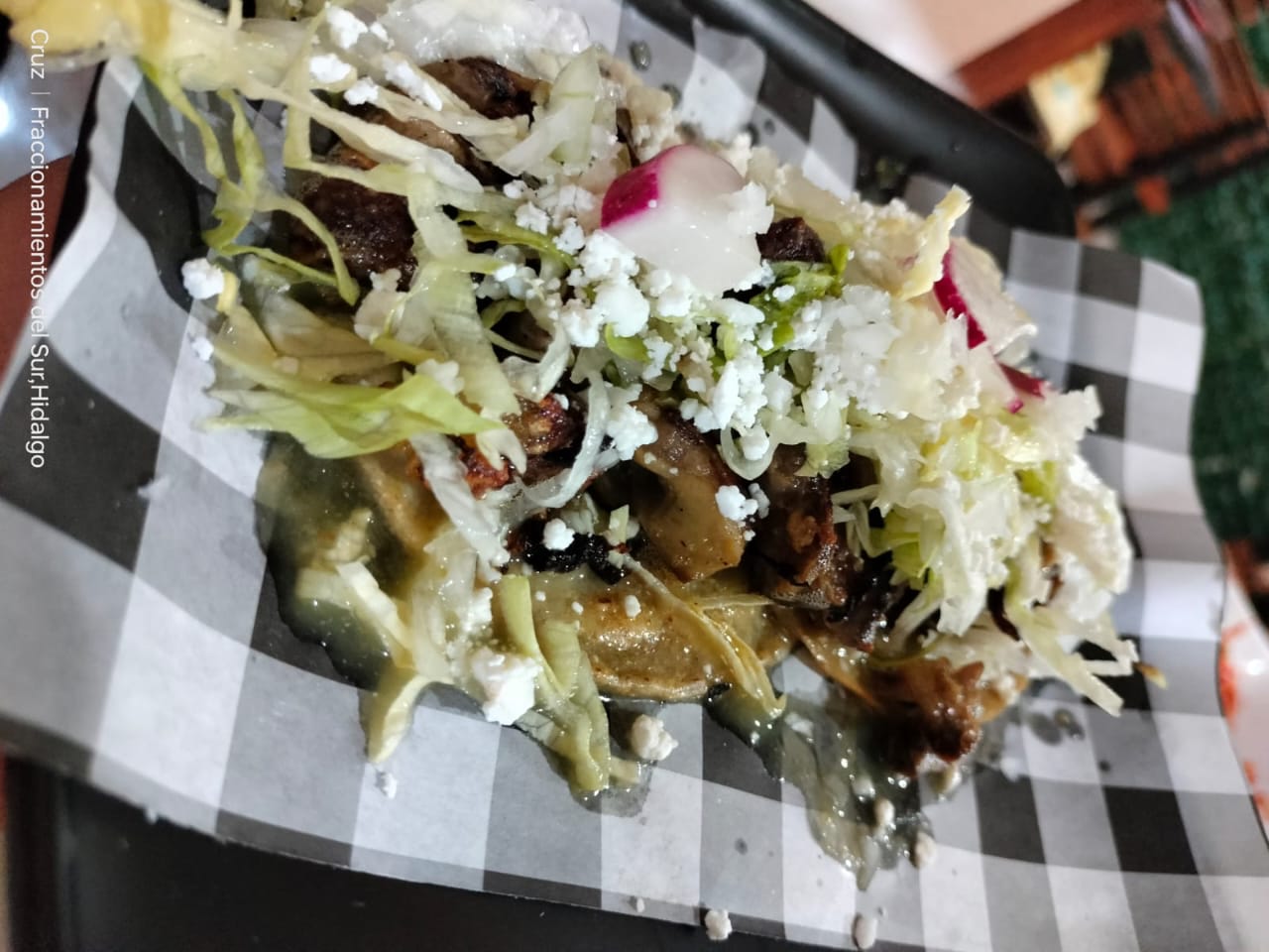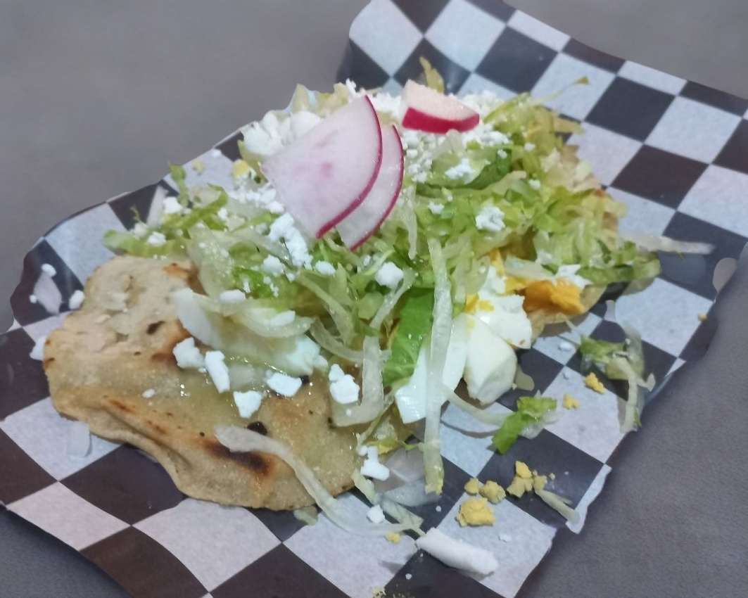 Base de dos tortillas, orden de mollejitas 3 pz picada, cebolla, lechuga y queso y rabano..