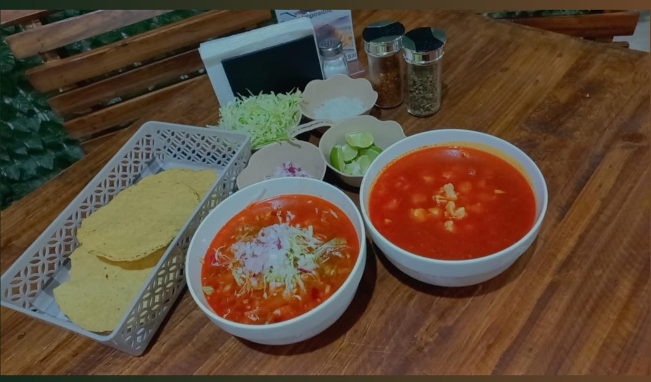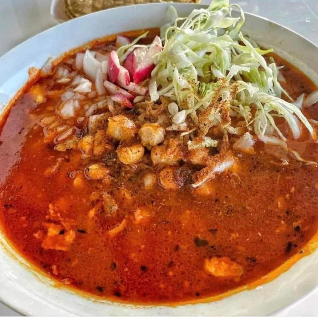 Pozole, acompañado de cebolla, lechuga, rábano, limón y tostadas.