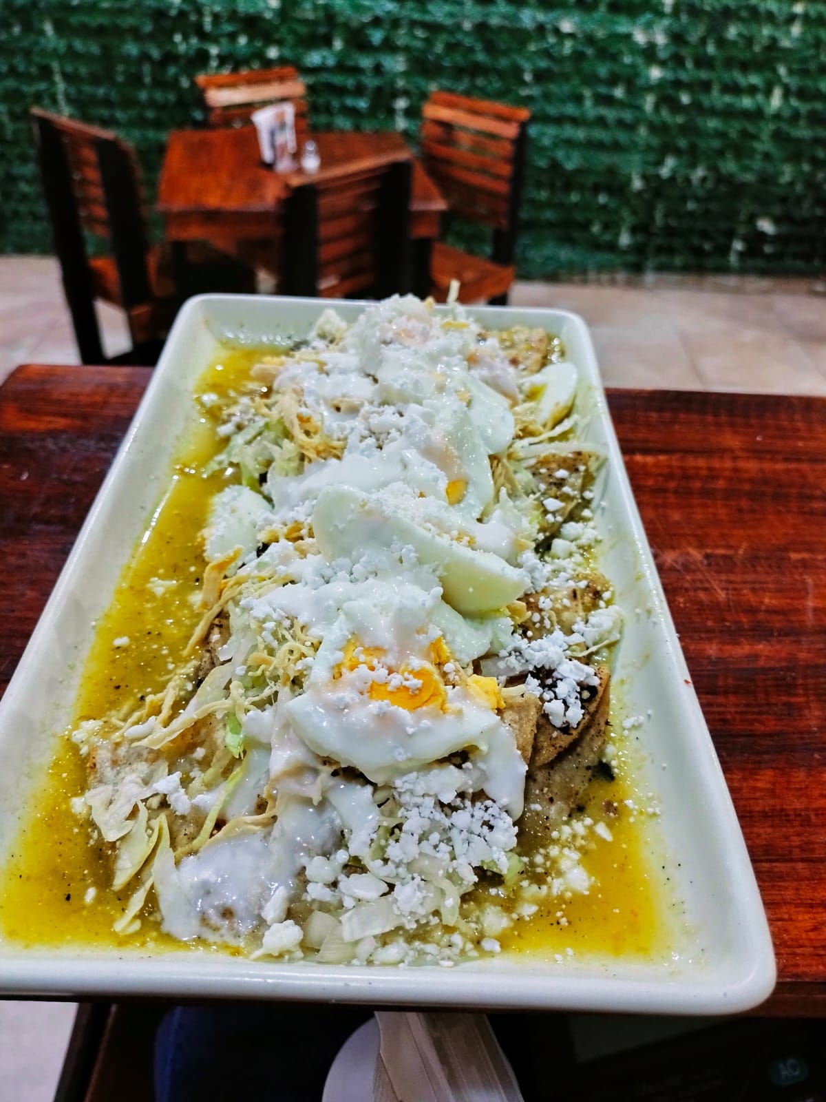 8 Tortillas de maíz rellenas de papa, base de salsa verde, cebolla, lechuga, pollo, huevo hervido, queso y crema.