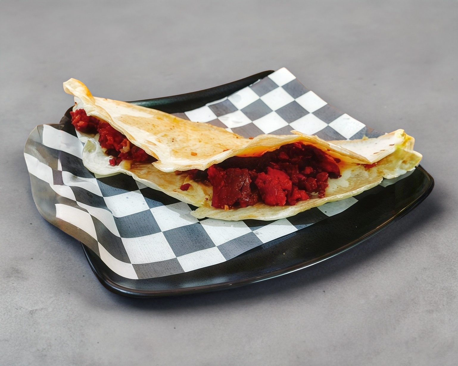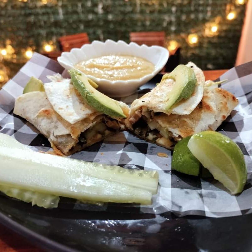 Tortilla de harina , base de queso fundido, carne de cerdo (receta especial), pepino, limon acompañado de salsa de piña con habanero
