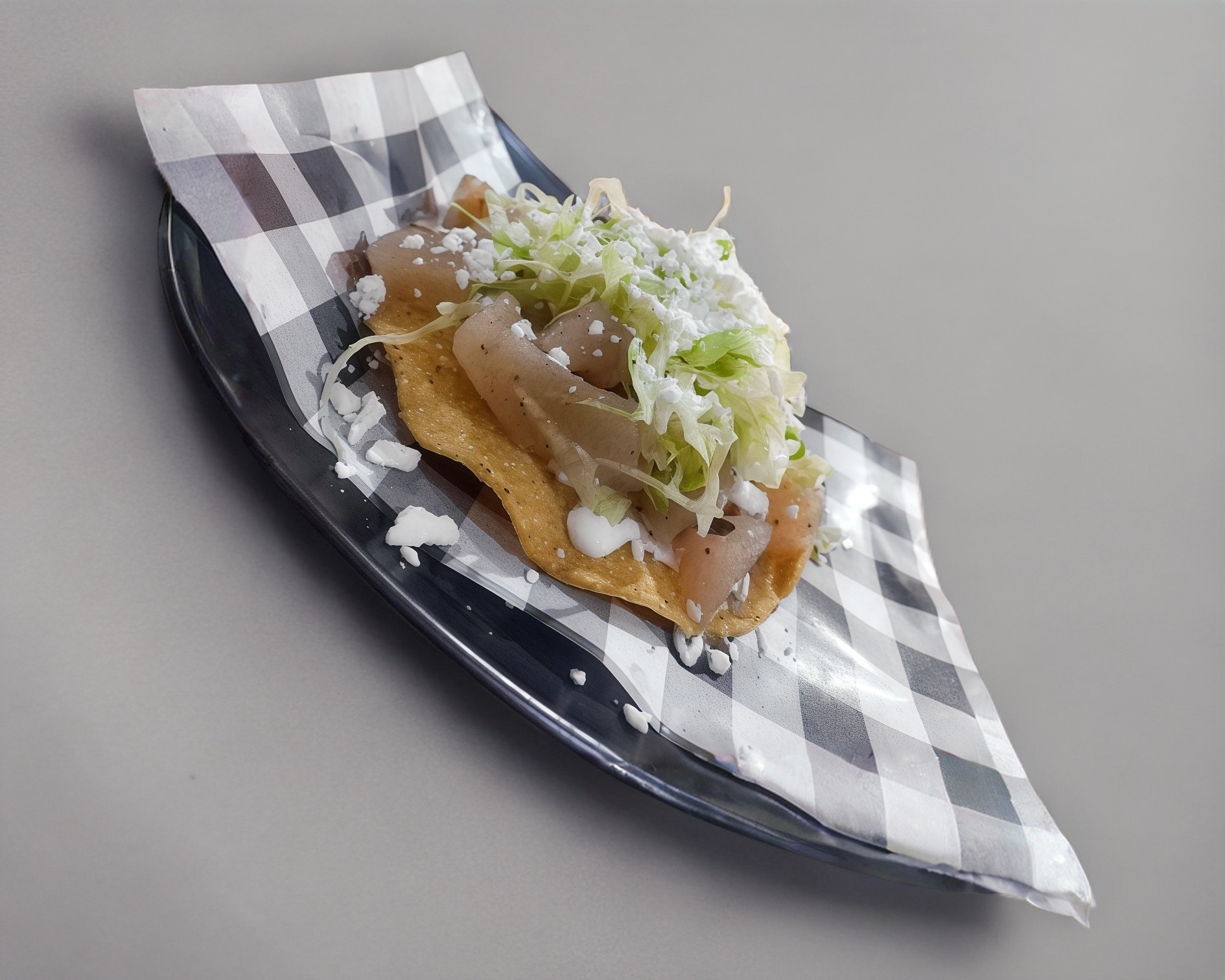 Tostada, base de crema , guisado a elegir: pata, tinga, pollo, jamon.