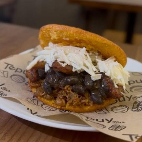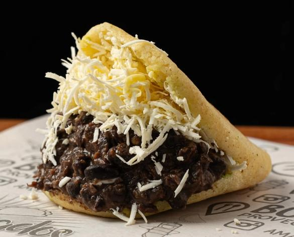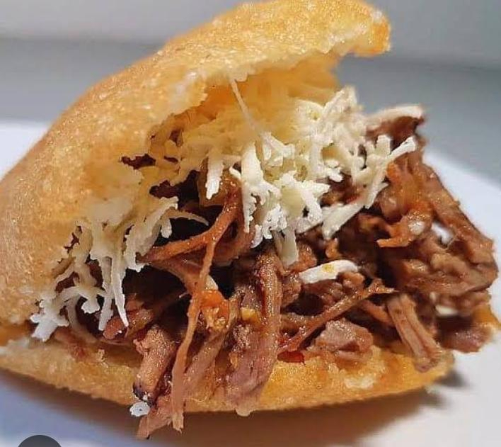 Arepa rellena de carne de res deshebrada, mechada, y queso Oaxaca.