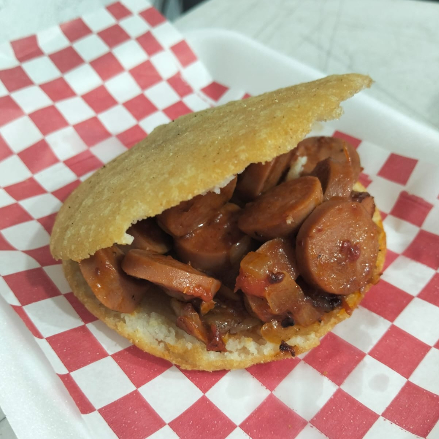 Arepa de harina de maíz sin gluten con salchicha en salsa de chipotle.