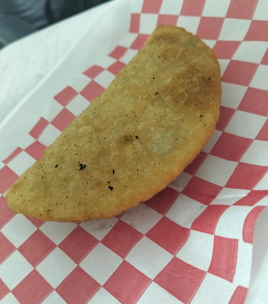 Empanada individual rellena de carne, frijol, plátano y queso.