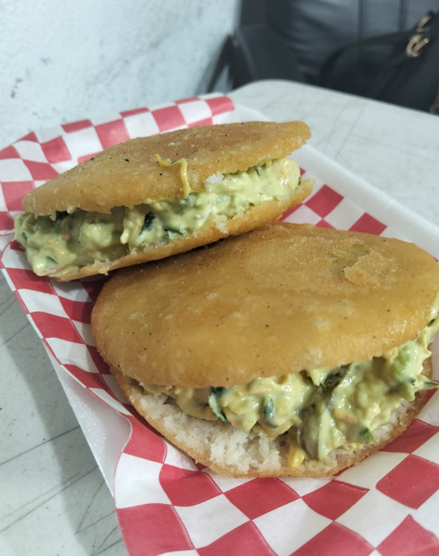 Arepa rellena de pollo, aguacate, chile, cilantro, cebolla y mayonesa.