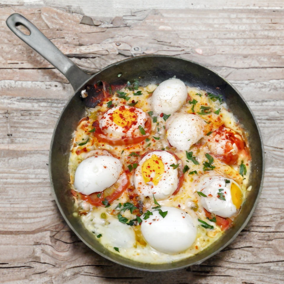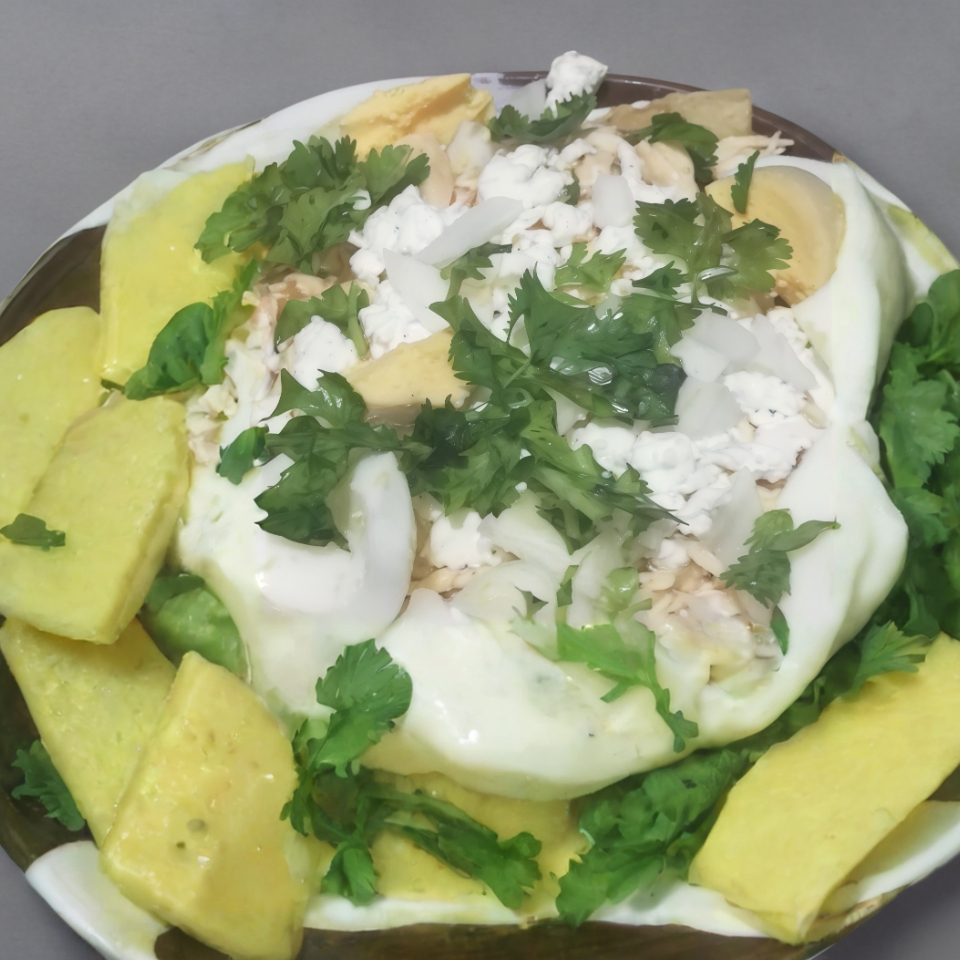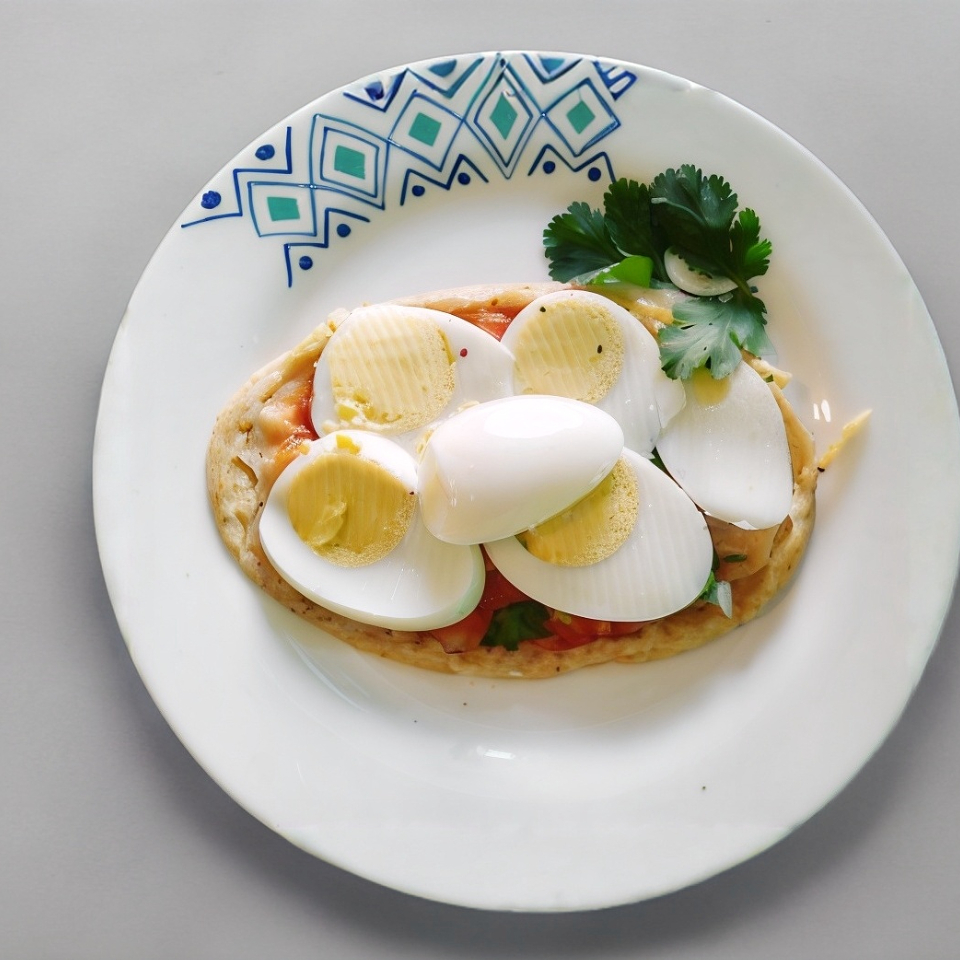 Base de jitomate, cebolla, chiles verdes, 3 huevos hervidos, partidos a la mitad cubiertos de queso oaxaca, ( incluye tortillas y salsa de la casa)