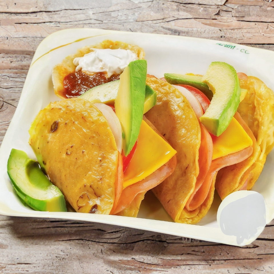 Jamon, queso amarillo, queso oaxaca, salsa, crema aguacate, cebolla, y jitomate.