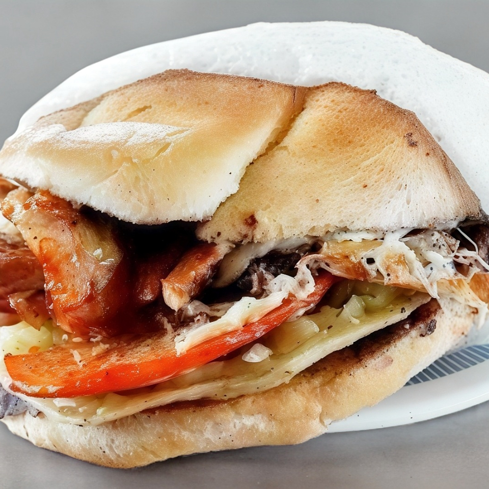 Bistec, 2 tortillas fritas, frijoles refritos en ambas tapas de la telera, queso oaxaca, queso rallado, lechuga, bañado en salsa verde.