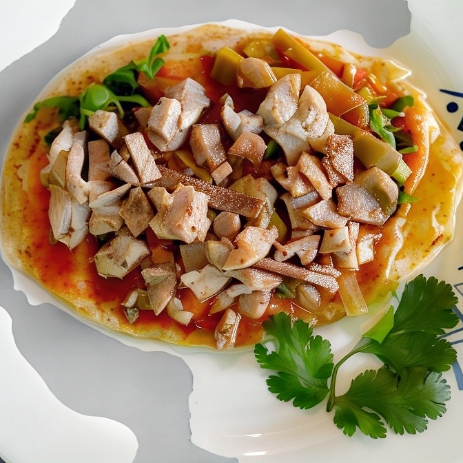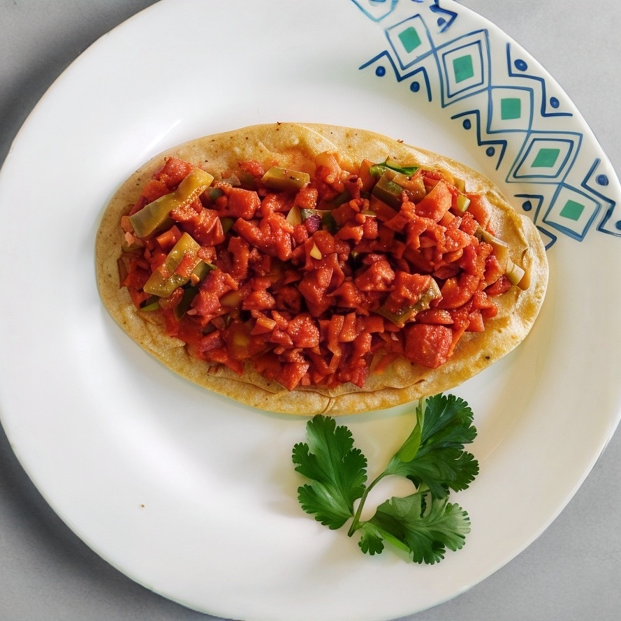 Carne con frijoles refritos, salsa de la casa, cebolla y cilantro.