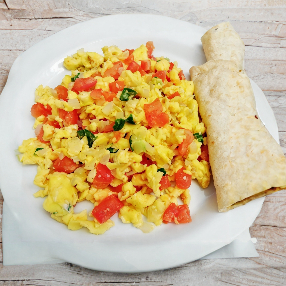 Huevo revuelto con jitomate, cebolla y chiles,lleva tortillas